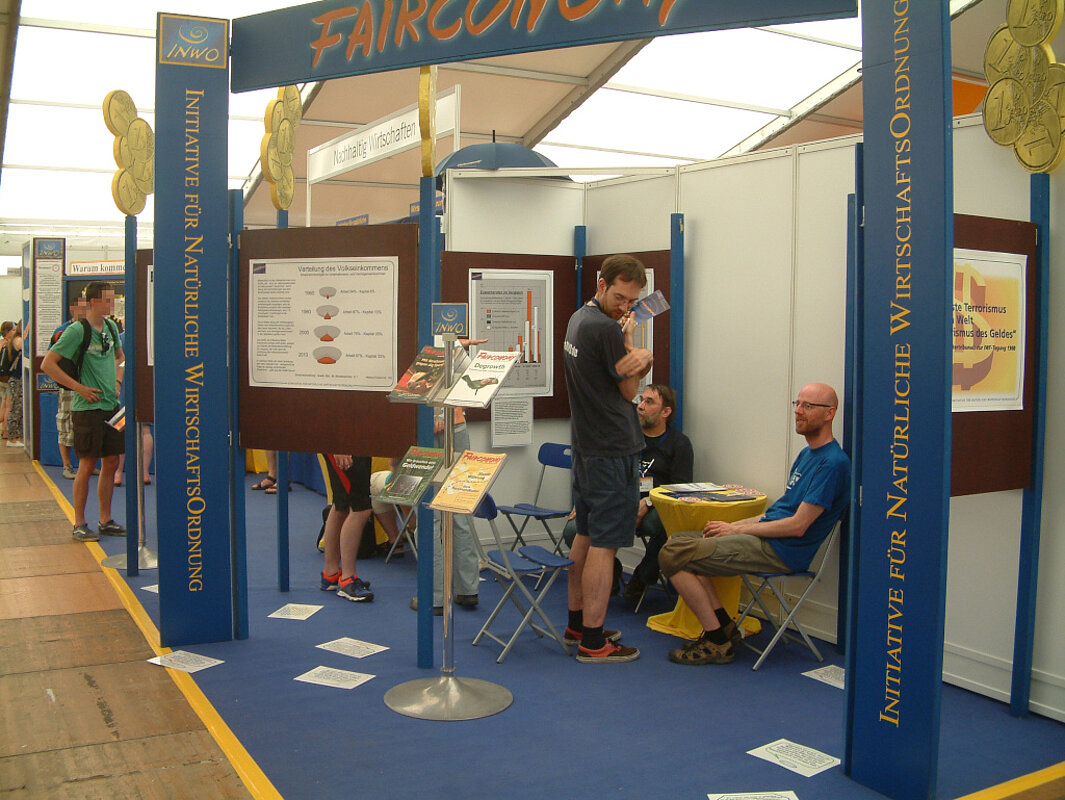 Am Stand hatten wir wie immer sehr viele Gespräche, lange und kurze, mit wechselnder Resonanz. Tatsächlich haben viele der Verweilenden einiges Vorwissen zum Thema und so mancher erinnert sich auch an die früheren Kirchentagsauftritte der INWO. Zahlreiche Fairconomy-Zeitschriften wurden von den Besuchern zum späteren Lesen mitgenommen. Immerhin eine Besucherin war direkt so überzeugt, dass sie zum kurz nach dem Kirchentag stattfindenden INWO-Sommerfest in die Silvio-Gesell-Tagungsstätte nach Wuppertal kam.