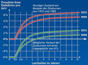 Gegenwärtig erhält man für Bargeld gar keinen Zins, für Giroguthaben nur sehr selten. Für Tagesgeld (große Summen) und für längerfristige Anlagen gibt es höhere Zinssätze - je nach Marktlage. Unter den Verhältnissen einer Liegegebühr auf Geld (auch "Umlaufsicherungsgebühr" genannt) bezahlt man für Bargeld und Giroguthaben z. B. 6% im Jahr oder 0,5% im Monat. Längerfristige Anlagen sind von der Gebühr befreit. Für sie erhält man dann - auch je nach Marktlage - noch einen geringfügigen Zins.